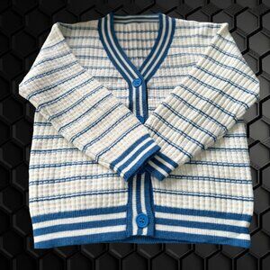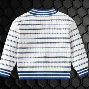 Cozy children’s knit cardigan in a classic blue and white stripe design. Features a V-neckline, ribbed texture, and blue button closure at the front. Made from soft, breathable fabric, this cardigan is perfect for layering in spring, fall, or cool summer evenings.