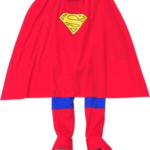 Features: Pull-on jumpsuit with hook and loop closure at the neck, a handy tie belt for easy adjusting, and a removable cape for versatile superhero looks. Includes jumpsuit with attached boot tops, a vibrant cape, and a belt—perfect for any heroic mission.