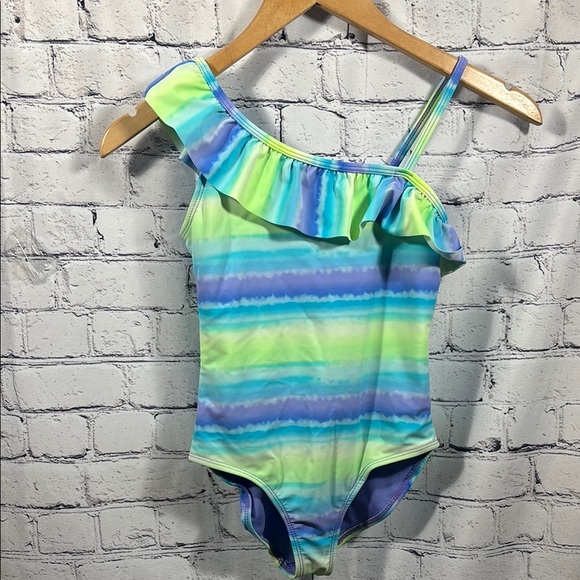 This vibrant kids swim one piece features a playful blue and green striped pattern. Perfect for fun days at the pool or beach.