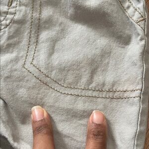These stylish tan shorts are perfect for active kids. Featuring a comfortable drawstring waist, they are ideal for playtime and casual outings. Strings are not adjustable. Details shown in pictures. Discoloration on the front is not very obvious (check 2nd picture).