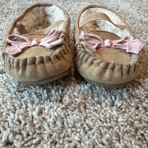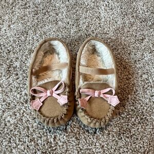 Kids Tan Moccasin with Pink Bow Slippers house shoes Size 5/6