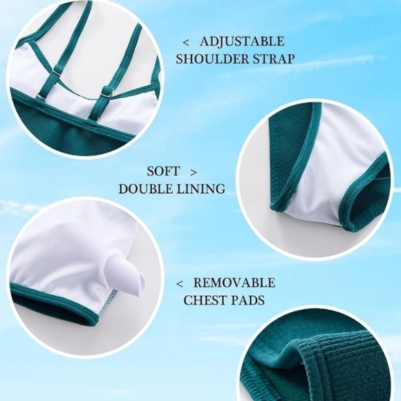 Stylish and comfortable teal bikini set for kids. Perfect for fun days at the beach or pool. Removable pads. Striped texture. Brand new, never worn, Hygienic liner.
