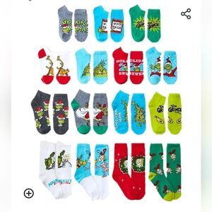 Kids' The Grinch 15 Days of Socks Advent Calendar. Bring cute Christmas style to your kid's festive wardrobe with this The Grinch 15 Days of Socks Advent Calendar. Crafted from lightweight fabric with a hint of spandex, these socks are sure to keep their feet comfy. This advent calendar includes four pairs of crew socks, four pairs of quarter socks and seven pairs of no-show socks, each featuring the Grinch, Max and other Grinch characters and text to make their countdown to Christmas even more exciting.