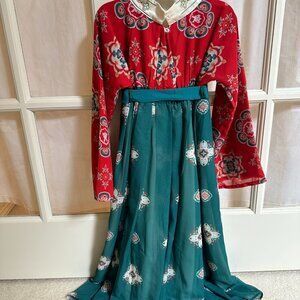 Color: Red top with embroidered details, green patterned skirt.