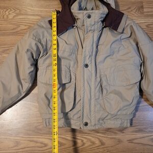 Kids puffer jacket with a unique two-tone design. Features a khaki body with a purple hood accent and purple and teal lining. By Pacific Trail. Size 14.