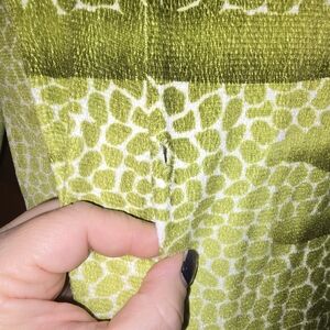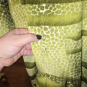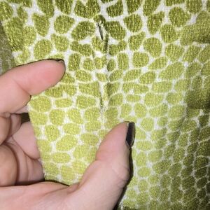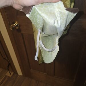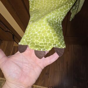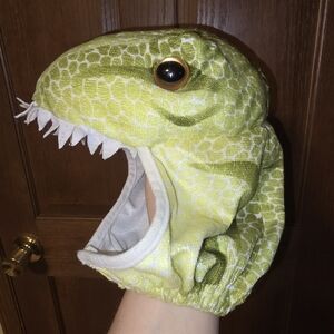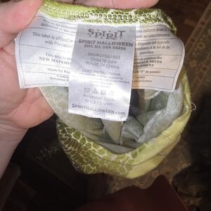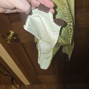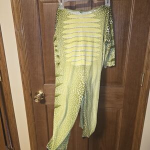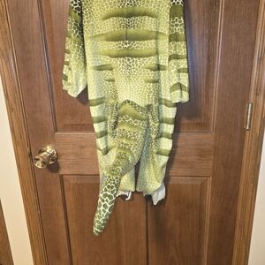 Dinosaur costume set for sale made by Spirit Halloween. Features realistic scales and eyes. Easy to wear. The condition is marked "good" due to 1 elastic foot strip being broken and a small (size of a pencil eraser) hole near the velcro closure on back. Great for playing in or for Halloween too! Costume is lightweight and its easy to add layers underneath to make it warmer.