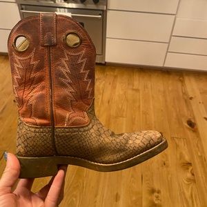 These stylish kids' boots feature a classic western design with a rich brown and tan color scheme. Perfect for any little cowboy or cowgirl, they offer both comfort and durability.