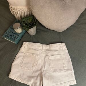 High rise kids white Jean shorts. Flat patched pockets on the front. Cat and Jack denim, 100% cotton.