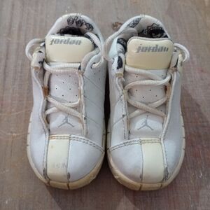 Stylish and comfortable, these white and cream Jordan shoes are perfect for active kids. Featuring a durable design, they offer great support for everyday adventures.