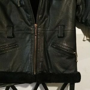 Y2K Black winter leather jacket with faux fur collar and lining inside sure to keep you warm gently used preowned condition no belt .