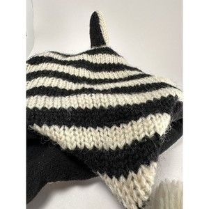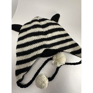 Adorable wool earflap winter hat with zebra theme and zebra face and ears, pom poms on the tie closure ends, fleece lined, made in Nepal