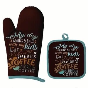 The set includes one oven mitt and one pot holder, both in a bright and cheerful multicolor pattern. Perfect for anyone who has kids and loves coffee and wants to add a little personality to their kitchen.
