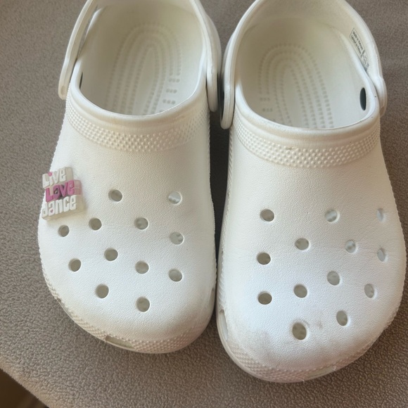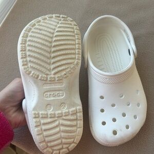 Kids CROCS youth size 2. I have wiped these down completely and for being a solid white shoe I would say they are in excellent condition. The charm is removable. Smoke free home!