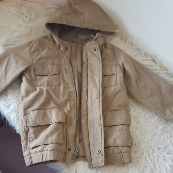 Boys Khaki hooded jacket with front zip/velcro closure. Elastic sleeve end for extra warmth. Quilted lined for soft, warm feel. Small blemish on the back bottom of the coat.. Great for Fall season!