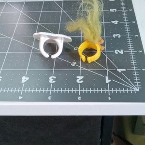 Bundle of 2 kid's rings. One is a plastic heart with two tulips and other decorations on a white background. Other is a small troll with yellow green hair on a yellow plastic ring. Both have open space in the back of the ring to allow fit flexibility.