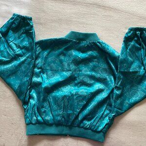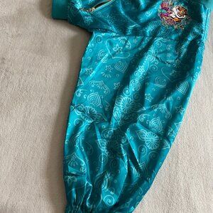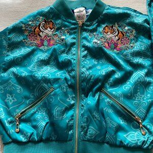 kids size 9/10 BEAUTIFUL and gently used, Disney Rajah, from Aladdin, “Jasmine” Bomber Jacket, with dolman sleeves, embroidered appliqués on both shoulders, and featuring Rajah, Jasmine's tiger, with flowers, and sequin detailing. Has gold colored zipper accents, and ull front gold colored zip. The beautiful Interior design features Jasmine screen art in the satin feel lining. Characters are from the movie ALADDIN. No longer selling at Disney Store.