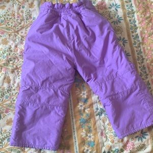 Purple snow pants with zipper pockets and Velcro snap button front.