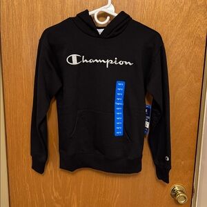 This is a kids size 10/12 black with white embroidery champion hoodie new with tags
