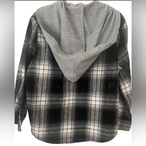 Kids unisex size 4 black and white plaid button down shirt with hood
