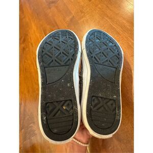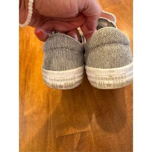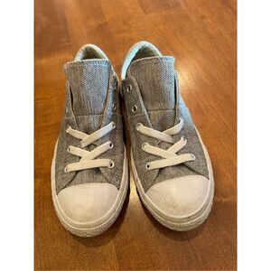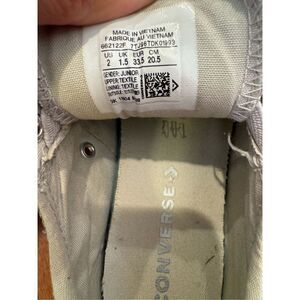 Kids Converse sneakers. They are a kid size 2. Not toddler size. These are junior sizes. The European size on these are 33 1/2. They are from a smoke-free and clean home. Gently worn. Given the gender, neutral color. They could also be worn by a boy if desired.