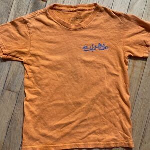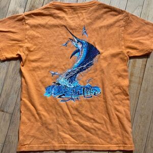 Blue swordfish graphic, fits size 4-6. Good preowned condition, some fading but no stains or pulls.