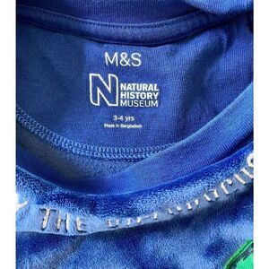 Kids Soft Warm Dinosaur Sweatshirt Size 3-4 Appliqué and embroidered on softest plush fabric. Marks & Spencer for the London Museum of Natural History. Pilling and mended on inside (see photo)but outside of shirt in good condition. Price reflects. See photo of tag for fabric content.