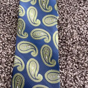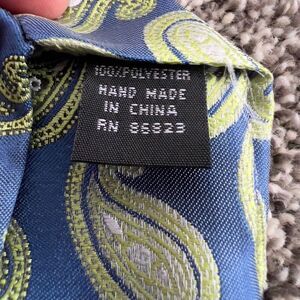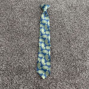 A classic vintage tie featuring a vibrant paisley pattern in blue and green. The tie is made from high-quality silk, offering a smooth texture and elegant appearance.