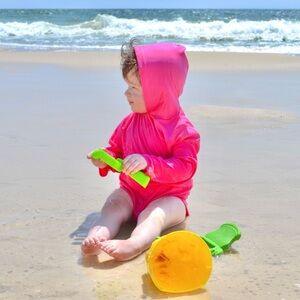 The Sun Blocker Romper with a UPF 40 rating provides excellent protection without exposing your baby's delicate skin to chemicals. Great swimsuit or cover for pool and beach days. Snaps at the bottom for easy on and off and diaper changes. In EUC, no flaws noted.