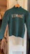 New England Donegal wool sweater from preppy classic Kiel James Patrick. Chic and warm turtleneck sweater. Features 'Vermont' text design. Ideal for cool weather. Forest green background with white “Vermont” lettering and tan leaf for the “o.” Slight puff sleeve. Long sleeve. Soft roll at hem, cuffs and turtleneck.