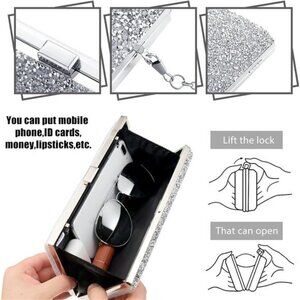 Rhinestones Clutch Spacious Interior Space: the women jewelry sets clutch purse measures approx. 8.7 x 4.7 x 2 inches, big enough for you to use; Inside the bag is a large compartment for a cell phone, lipstick, eye shadow, change, keys and more, and a detachable chain