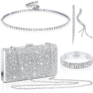 ⚡Kigeli 4 Pieces Women Rhinestone Evening Clutch Bag Bling Earring Necklace⚡
