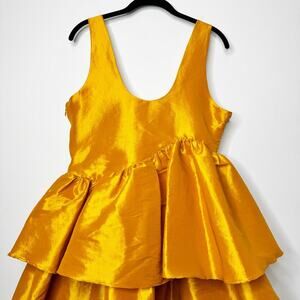 sun gold yellow dandelion marigold party wedding cocktail maximalist bold bright colorful formal travel resort fun art bold statement shiny silk look designer luxe luxury flouncy skirt satin ruffle summer wedding guest trendy birthday outfit going out european summer dopamine dressing chic ethereal