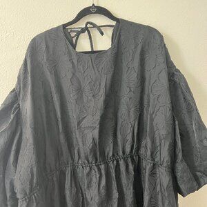 Romantic, voluminous, and effortlessly chic — this Kika Vargas for Target dress features embroidered floral detailing on a lightweight black fabric with dramatic puff sleeves and an open back with tie closure. The gathered waistline gives it shape without sacrificing comfort, and the full silhouette creates an elevated yet easy look.