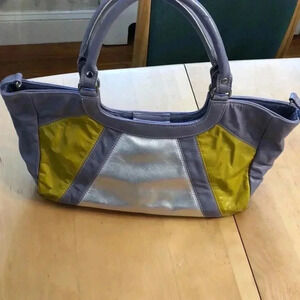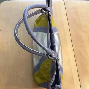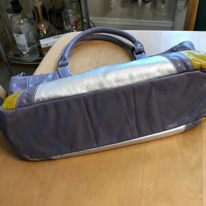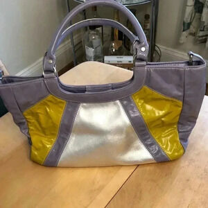 Kiki Pearl silver/lavender/chartreuse shoulder bag. Magnetic close. One internal side zippered pocket. Measurements are 14” wide x 9” tall x 4” deep. Strap drop is 7”.