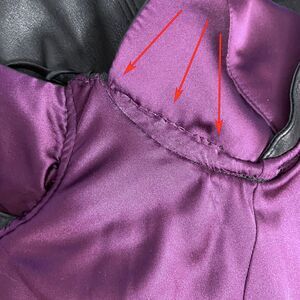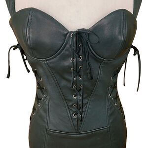 Black 100% lambskin shell with burgundy 100% silk lining. Corset bodice with front and side satin tie fastenings. Center back zipper with hook and eye closure. Leather shoulder straps in front with adjustable elasticized straps in back. Sweetheart neckline. Fitted silhouette, with center 10-inch slit. Made in New York City.