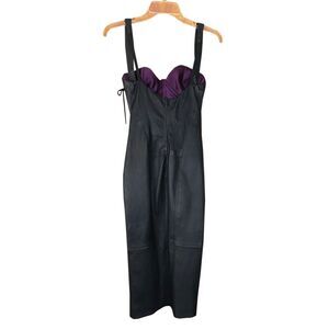 Kiki de Montparnasse Corset Effect Midi Dress Size 6 Black Lambskin Silk Lining. Dress is in good preowned condition. The right side of the bustline has been professionally repaired, both the exterior lambskin and the lining. (Please see last two photos.) Dress is pictured on a size 6 dress form, but I was unable to completely zip it up in back, so it may run small in the bodice. Please refer to measurements for best fit.