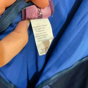 Made in the USA, in good condition there is marks on the tie strap, and on the inside there is two parts were the seam thread came out(double check the pictures) other than that this is a very beautiful deep blue and soft to the touch dress.