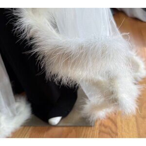 Hi Brooke - I took a photo on the manikin of the robe over a black long dress - I do not think the photo came out that terrific, however I am going to add it to the listing for 24 hours. I took 2 close ups of the edge of the robe. The listing is for a fur trimmed robe - it is actually feather trimmed. An employee created the listing for me, and I will need to update it so that it is accurate.