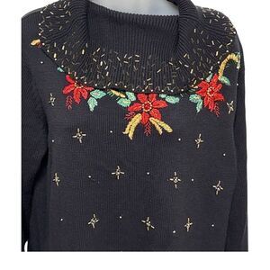 Kikit Holiday Sweater Womens Size Large Beaded Cowl Neck Poinsettia Black