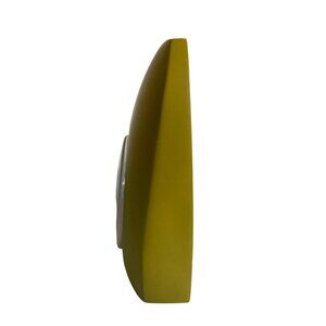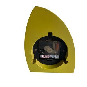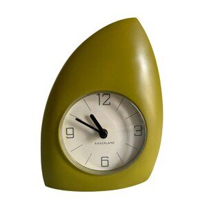 This retro-style clock adds a vintage touch to any space. Its unique shape and vibrant olive color stand out.