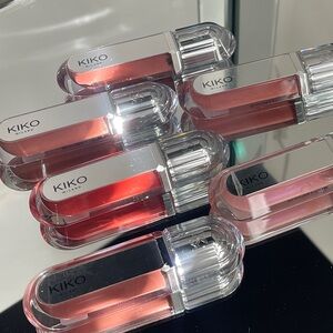 Elegant kiko cosmetics lip glosses in vibrant pink and red shades. Perfect for a glossy, luxurious look.
