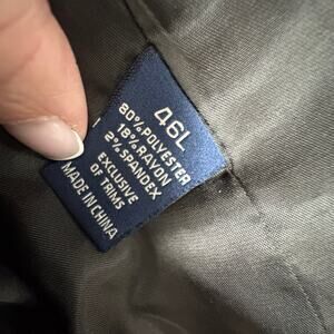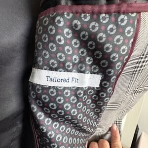 Kilburne + Finch men’s tailored-fit sport coat in a classic black and gray plaid check. Size 46L. Two-button front with notched lapels and dual flap pockets. Stylish contrast polka-dot lining with maroon trim. Made from a flexible and durable blend (80% polyester, 18% rayon, 2% spandex).
