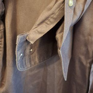 Nice purple dress shirt. Long sleeves, chest pocket, collar and buttons all down the front. Both cuffs have a bit of tearing (see last photo), but this likely wouldn't be noticed when it's worn, or you could roll the sleeves up. Size Large. Measures about 24 inches between the pits and 29 inches long. Lightweight and soft.