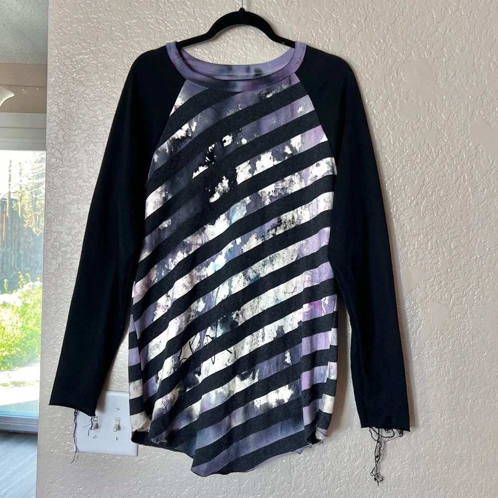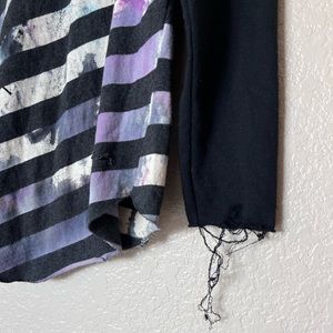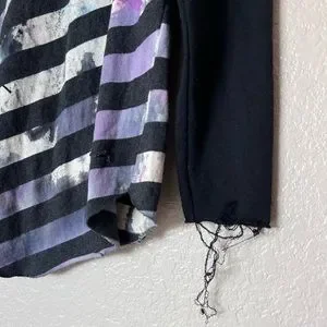 Striped design on torso front and back with purple and blue paint splashes