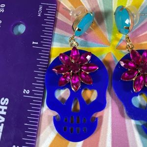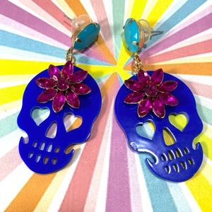 Gorgeous Royal blue laser cut acrylic skulls with fuchsia rhinestone embellishment flowers.