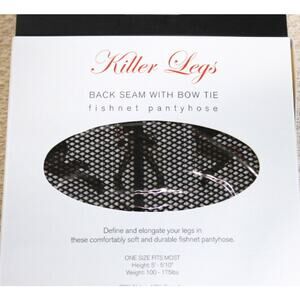 Killer Legs by Yelete Black Fishnet pantyhose with back seam and bow tie. One size fits most, height 5' - 5' 10", weight 100 - 175 pounds. New in box.