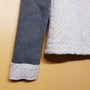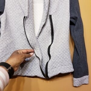 Women's gray and black side zip sweater or sweatshirt by Killion, size medium. Listed as women's, but can be worn by men as well. Ribbed texture; cotton and polyester blend. Excellent pre-owned condition; no flaws.
