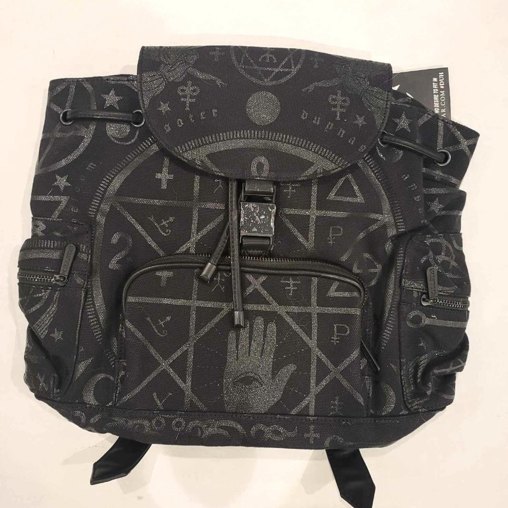 Killstar black backpack with shiny occult symbols printed all over. Has adjustable back straps and drawstring around the bag. Has a flap with metal buckle. Main pocket has an inner zippered pocket and two little inner pockets. Has a front zip-up pocket and two side zip-up pockets.