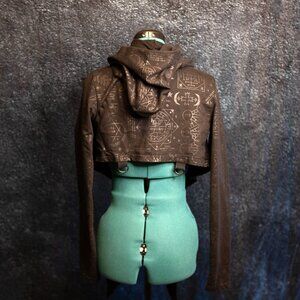 Features: Oversized hood, long sleeves, draped front, cropped back, occult celestial graphics, D-ring accents