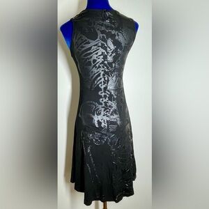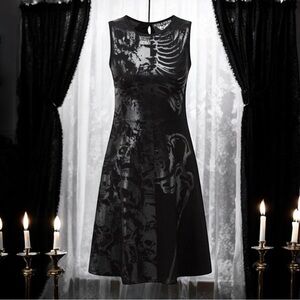 Killstar brand skeleton fit and flare dress, women’s XS. Features a sleeveless black jersey knit material with a shiny black print skeleton overlay (black on black), with a tiny keyhole back. Fits a true XS, pull over style with a scoop neck.